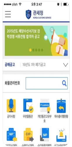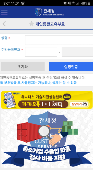 이름, 주민등록번호, 휴대폰 본인인증을 거쳐 부호 조회 가능 - 모바일 관세청 앱 사용
