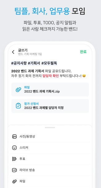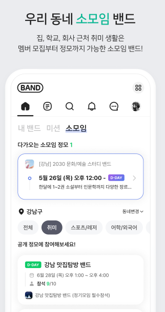 밴드는 그룹 멤버와 함께 하는 공간입니다. 동호회, 스터디, 주제별 모임을 밴드로 시작하세요.