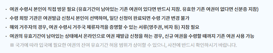 - 유효기간이 남아 있더라도 새 여권 수령 시 반납 필수