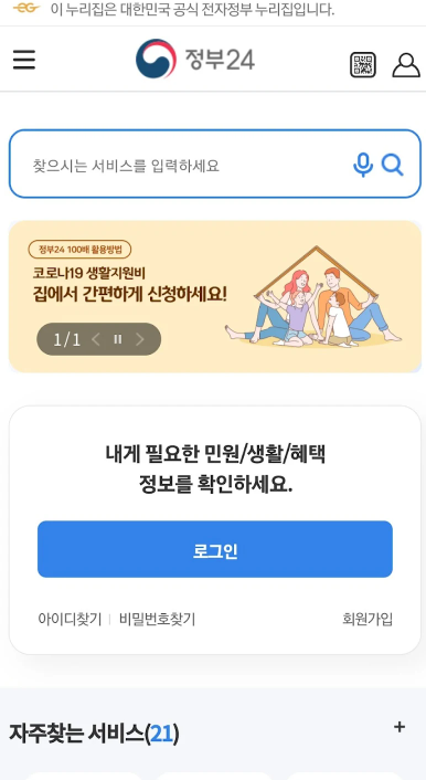 정부24는 정부의 민원 서비스, 정부혜택(보조금24), 정책정보/기관정보 등을 한 곳에서 한 눈에 찾을 수 있고 각 기관의 주요 서비스를 신청 조회 발급할 수 있는 대한민국 정부 대표 포털입니다