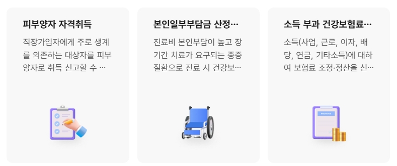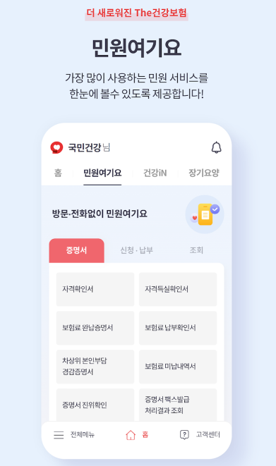 The건강보험 서비스는 공단 홈페이지내의 주요 콘텐츠를 국민들이 모바일에서 쉽고 빠르게 많은 정보를 접할 수 있도록 구성하였습니다.
