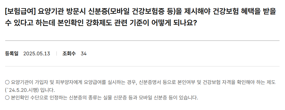 병원 가기 전에 꼭 준비해야 할 것, 이제 신분증이 아니라 모바일 건강보험증입니다 요즘 병원을 방문하면 예전과 다른 풍경이 눈에 띕니다. 접수대에서 "신분증 있으신가요?"라는 질문이 빠지지 않습니다. 그 이유는 2024년 5월 20일부터 시행된 요양기관 본인확인 의무화 제도 때문입니다. 과거에는 건강보험증이 없어도 이름과 주민등록번호만 말하면 진료를 받을 수 있었지만, 이제는 다릅니다. 건강보험 혜택을 받기 위해선 반드시 본인 여부를 확인해야만 합니다. 그리고 그 변화의 중심에 바로 모바일 건강보험증이 있습니다.
