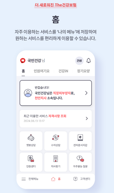 모바일 건강보험증은 별도 앱에서 운영되지만, 국민건강보험공단의 대표 앱 THE건강보험도 꼭 함께 설치해두는 것이 좋습니다. 이 앱에서는 다음 기능들을 제공합니다: