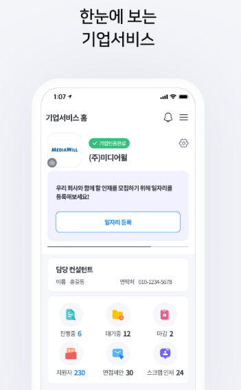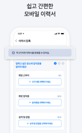 - PC와 모바일 앱 모두에서 간단하게 구직 가능, 전화, 문자 지원으로 빠른 연결