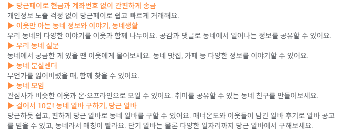 - 당근마켓 앱에서는 중고물품 거래 외에도 알바, 나눔, 커뮤니티 등 다양한 기능을 제공해요.