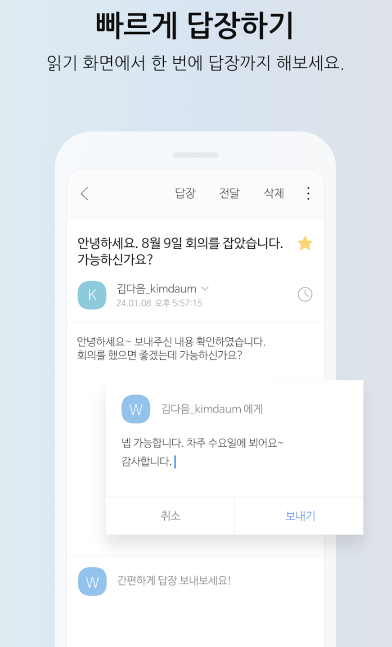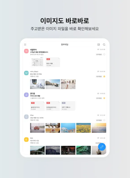 메일 확인뿐 아니라 메일 쓰기, 첨부파일 열람, 삭제 및 이동까지 모두 가능하므로 앱 하나로 충분히 커버할 수 있습니다.