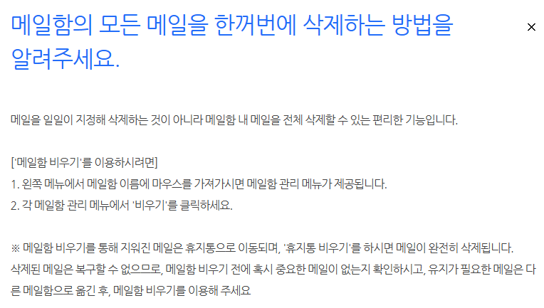 또한 '스팸함'과 '휴지통'은 자동 삭제 주기가 설정되어 있더라도, 수동으로 비워주는 것이 보다 빠른 정리에 도움이 됩니다.