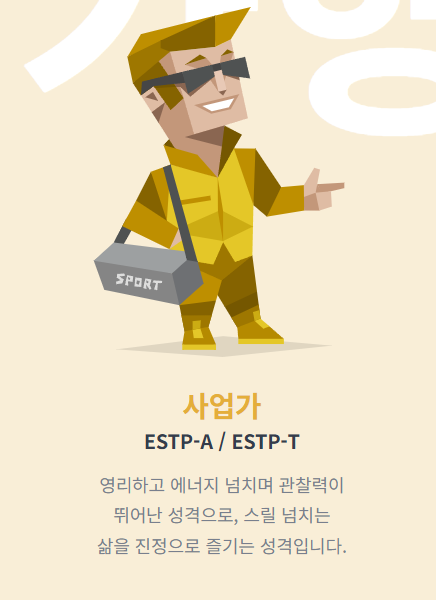 - ESTP: 스포츠 코치, 세일즈, 응급 구조 분야