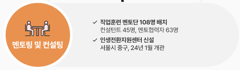 그 외에도 현장교육으로 실험 및 시험 제작 등 현장 실습을 하고 멘토링 및 컨설팅을 통해 직업훈련 멘토당 108면 배치를 진행하고 인생전환지원센터 신설을 진행합니다.